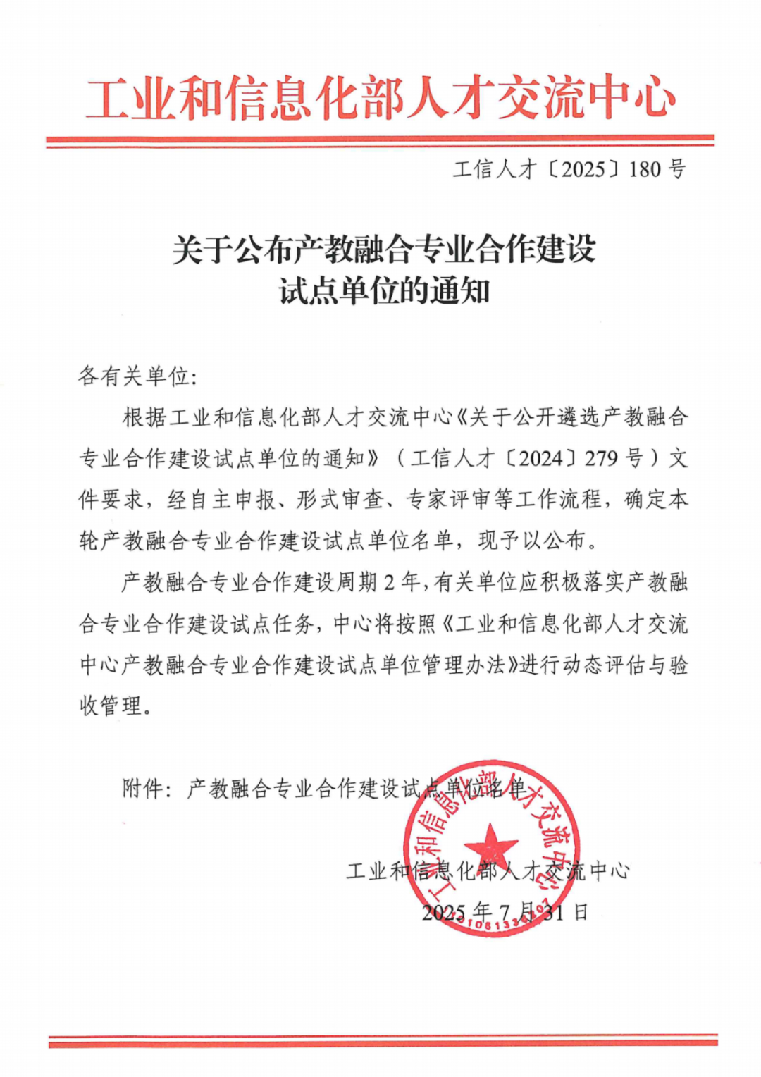 近日,工业和信息化部人才交流中心发布了《关于公布产教融合专业合作建设试点单位的通知》(工信人才〔2025〕180号),我校数字媒体技术专业、飞行器制造专业成为“产教融合专业合作建设试点单位”。