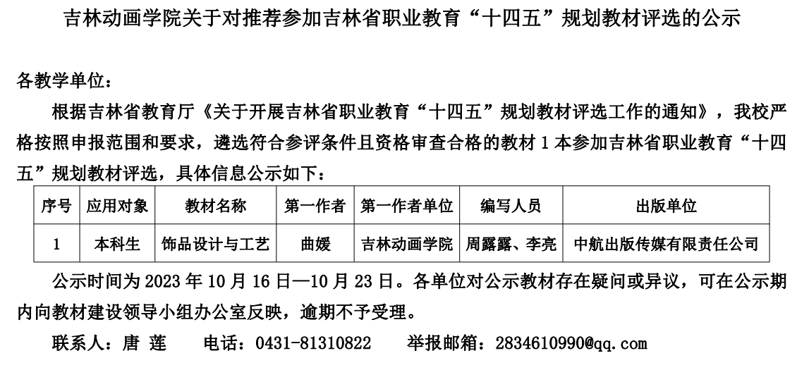 吉林动画学院关于对推荐参加吉林省职业教育“十四五”规划教材评选的公示