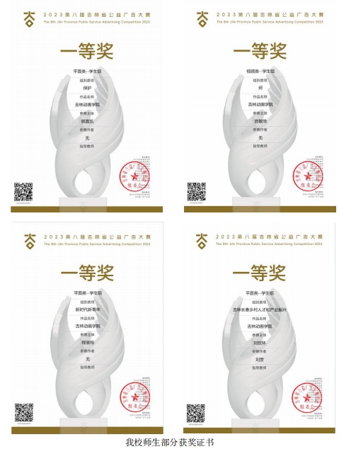 在由中共吉林省委宣传部、省市场监督管理厅、省纪委监委、省教育厅、共青团吉林省委、省农业农村厅、省委网信办、省文化和旅游厅、省广播电视局、省畜牧业管理局联合主办的第八届吉林省公益广告大赛活动中,我校师生凭借出色的创意和扎实的专业技能取得了优异的成绩,为学校争得了荣誉。