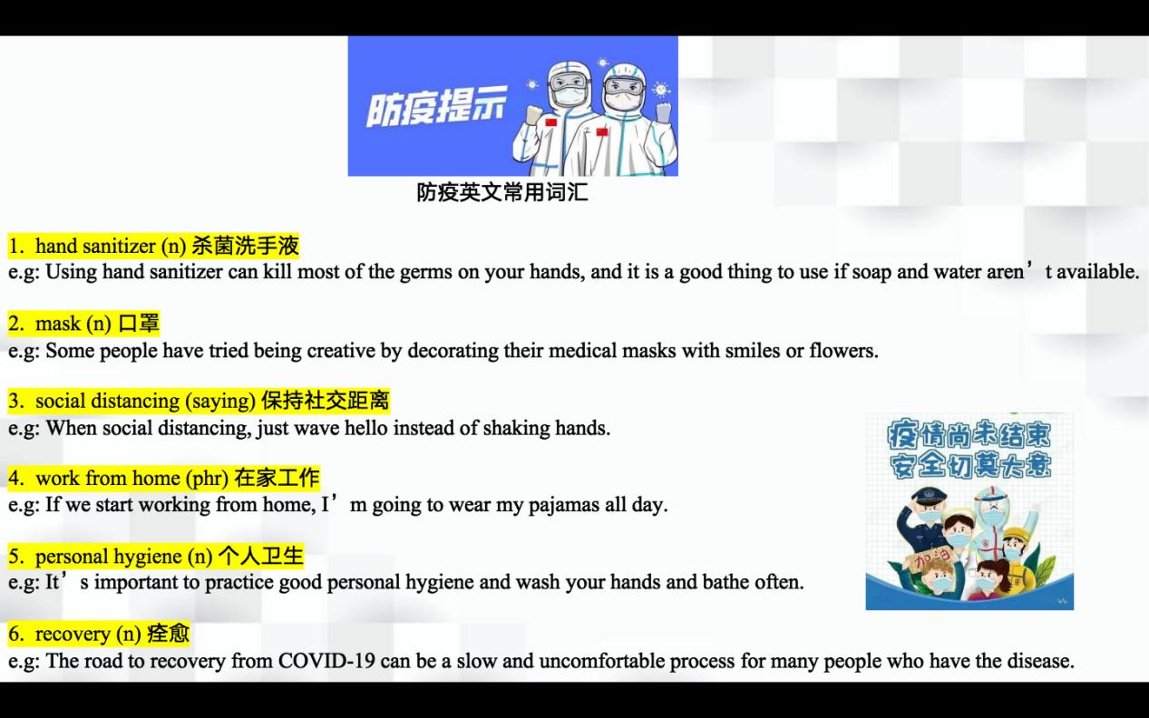 课前设置5分钟防疫抗疫专项知识讲解活动,列举在抗击疫情过程中,与学生们生活息息相关的一些英语词汇,并让学生结合自身情况造句。提高学生防范意识,拓展相关语言表达方式。
