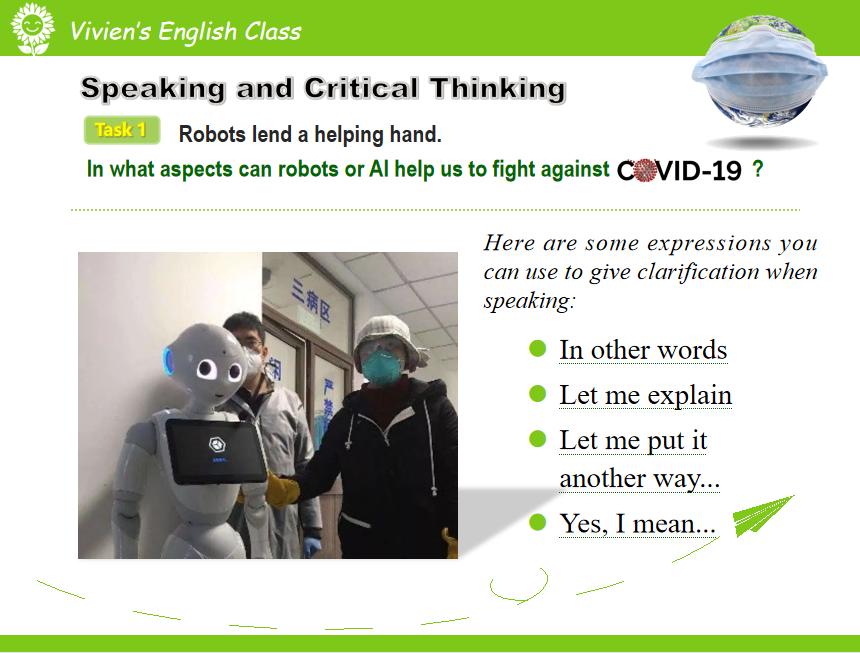 结合人工智能单元主题,组织学生进行思辨讨论——“机器人或AI技术在疫情防控方面可以起到哪些作用?”学生连线进行口语练习,并在学习通讨论区表达个人见解。提升学生的疫情防控意识,并认识到科技发展对疫情防控的重要作用。