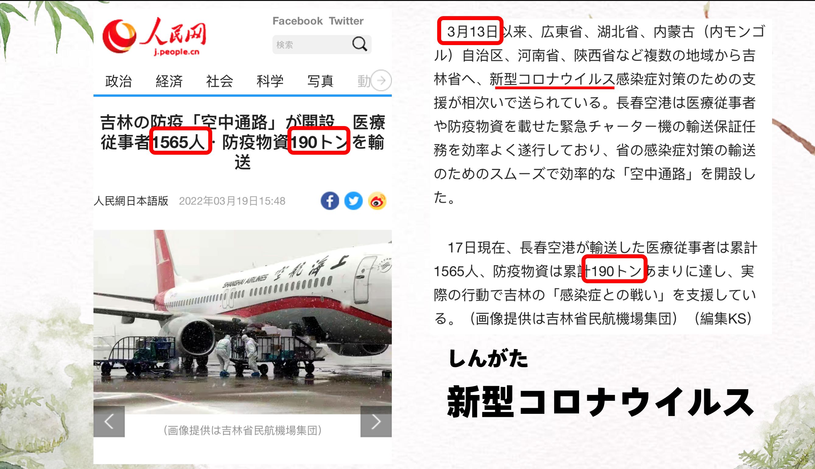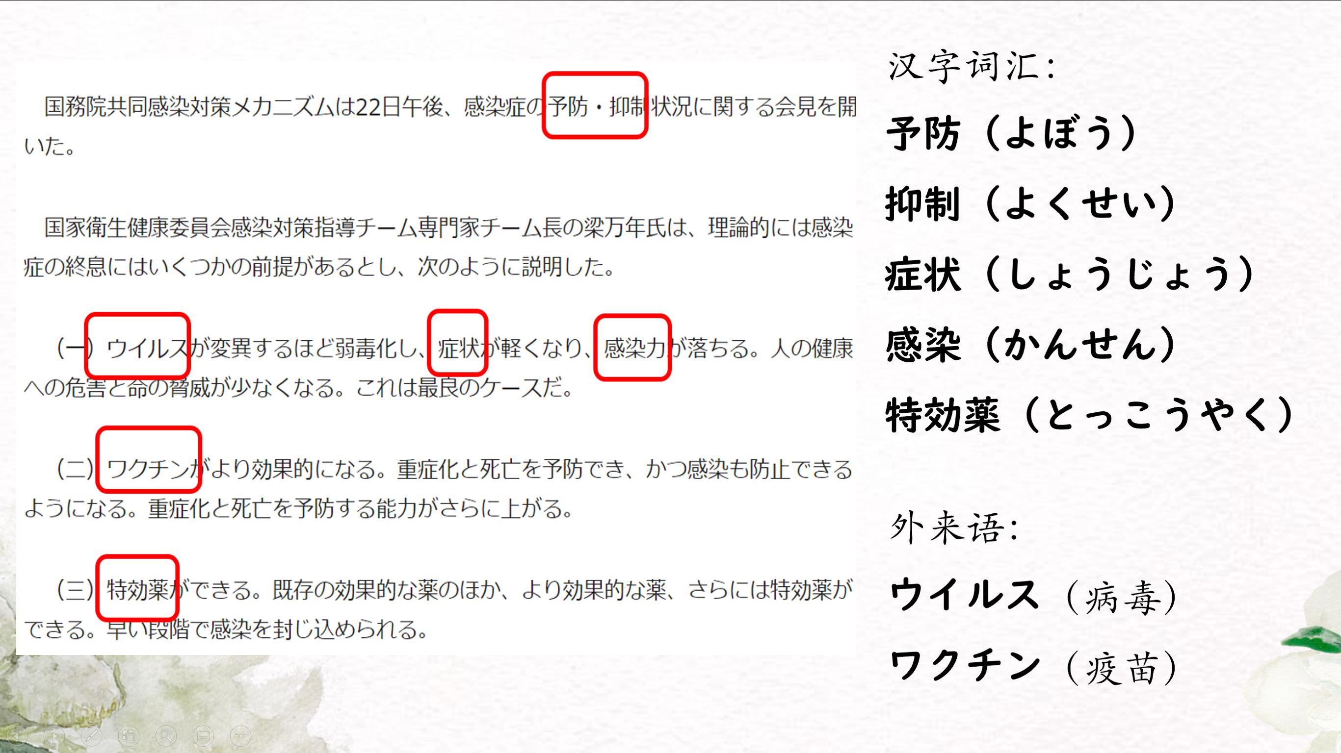 在讲解日语的数量词用法时,利用人民网日文版中疫情相关的时事新闻作为延伸阅读素材,帮助学生理解数量词在句子中的应用,如「1565人、190トン、4つ」等;同时,通过新闻内容,从汉字词汇和外来语两方面教授学生疫情防控相关的词汇表达。在教授学生精准日语表达的同时,积极引导学生关注疫情动态。