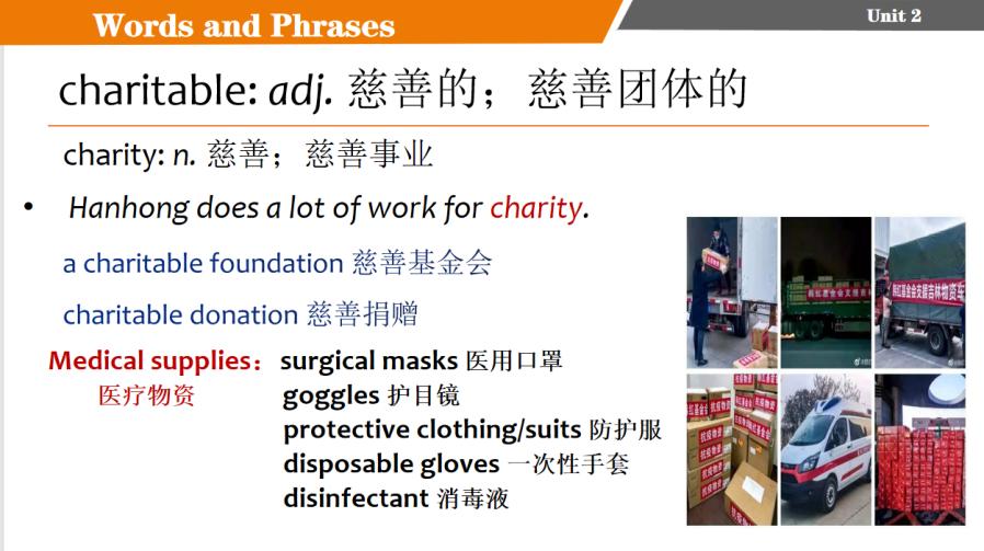 讲解单词charitable 与sacrifice,将英语词汇学习与抗疫主题相结合,检验学生的社会语用能力,将大学英语教学的人文性和工具性融合统一,深化学生对个人与社会联系的认识,自觉遵守防疫相关条例,坚定抗疫信念,常怀感恩之心。