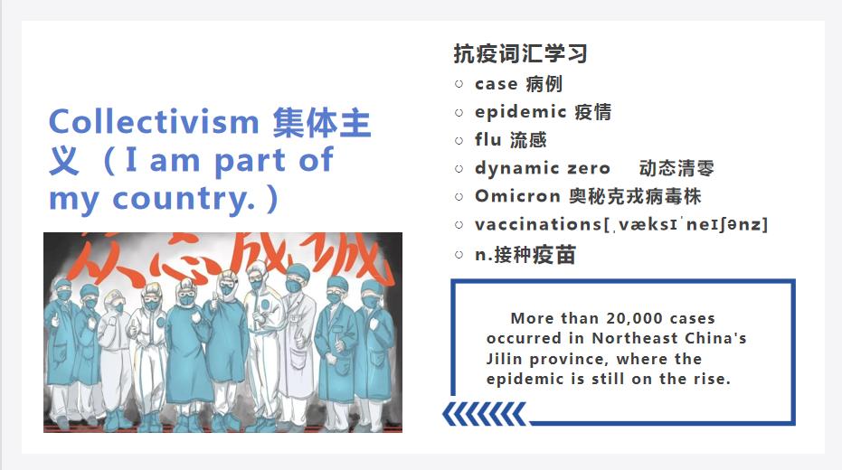 将单元词汇和抗疫知识进行融合,例如contribution(贡献)、individualism(个人主义)和collectivism(集体主义),采用线上提问和线下作业布置方式,让学生习得相关表达的同时去挖掘齐心抗疫的集体主义行为,感受祖国、社会、学校和抗疫者们的奉献与大爱,创作出有温度有情怀的抗疫作品。