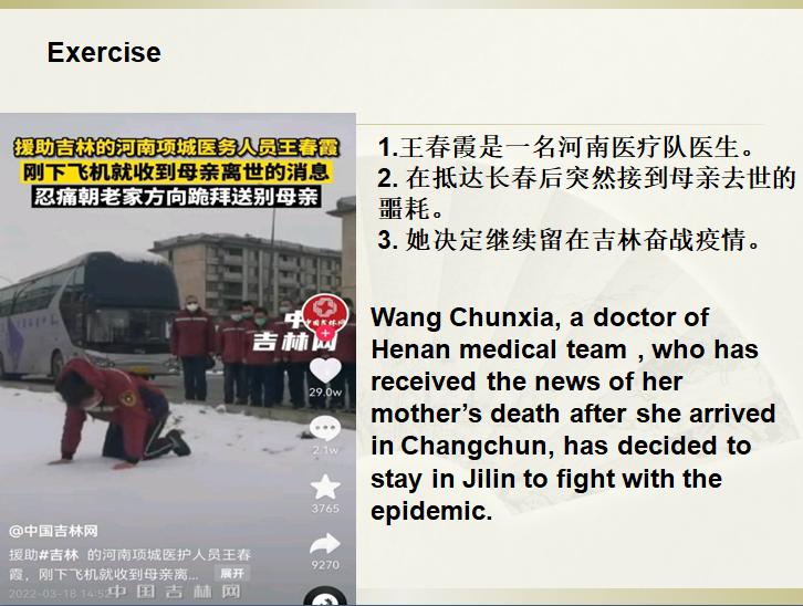 在定语从句语法知识中融入了河南援吉医疗人员王春霞的感人故事;使学生更好理解志愿者精神的内涵,鼓励大家积极参与到志愿活动中,弘扬奉献、友爱、互助、进步的志愿精神。并与本节课所讲的定语从句相结合,让同学们在学习通上完成对志愿者,志愿精神话题的讨论。
