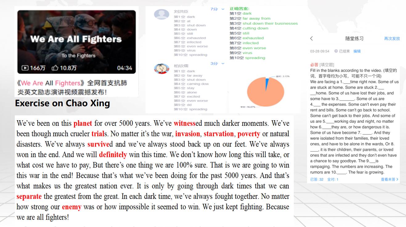 在听力学习中加入题为We are fighters的抗击疫情的励志演讲视频。通过截取片段,进行听力技能练习。结合演讲内容,引导学生意识到,困难只是暂时的,只要我们团结一致,一定会取得抗疫的胜利,增强学生的抗疫信心。