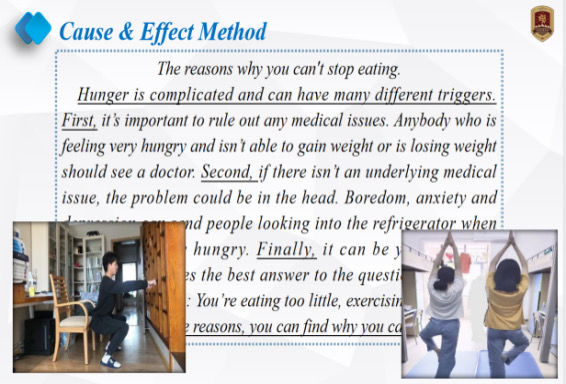 以当前学生在疫情期间一种生活现象的英文段落作为案例,进行因果写作技能的讲解。帮助学生更加容易接受和掌握语言技能,培养学生保持积极乐观的心态,养成良好的生活习惯,坚定战胜疫情的信念。