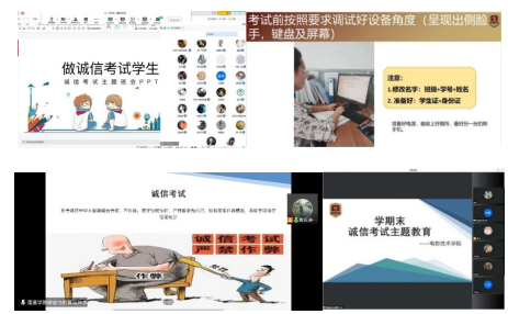 考之以诚,答之以信。考前,各教学单位通过召开主题班会、签订诚信承诺书等形式,对学生开展了诚信教育。考中,监考教师将诚信考试原则展示在公屏上,面对学生监视机位前有遮挡物、非写字手不在监控范围等异常情况,监考教师能够严肃考风考纪,及时提醒,与考生一起,贯彻了诚信考试原则。