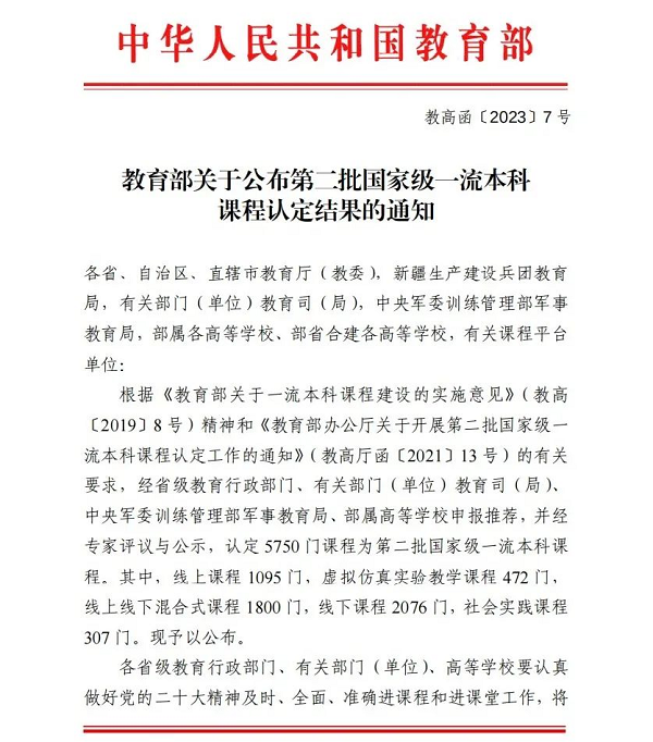 近日,教育部印发了《教育部关于公布第二批国家级一流本科课程认定结果的通知》(教高函〔2023〕7号),我校共2门课程获批,其中线上线下混合式一流课程1门、线下一流课程1门。本次为我校首次获批具有国家级称号的课程。