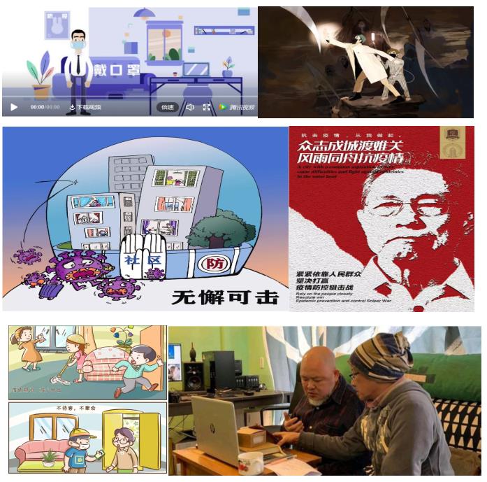 动画艺术学院新媒体动画系师生3天打造公益动画短片《上班族战“疫”指南》,及时有效地为全国复工的上班族提供返岗复工防护知识。设计学院徐欣教授工作室师生用招贴设计的艺术创作方式,设计了28幅传递正能量的宣传海报作品。漫画学院师生充分发挥专业优势,通过漫画形式助力疫情防控,传递必胜信心。电影学院肖继鹏老师原创歌曲《战疫》,献给在一线抗击病毒的英雄。电视与新媒体学院剧本创作工作室教师周媛、林剑锋联线中国台湾地区著名导演林正盛开展“在线大师讲堂”,面向工作室学生进行主题为“电影剧本创作”的在线讲座。
