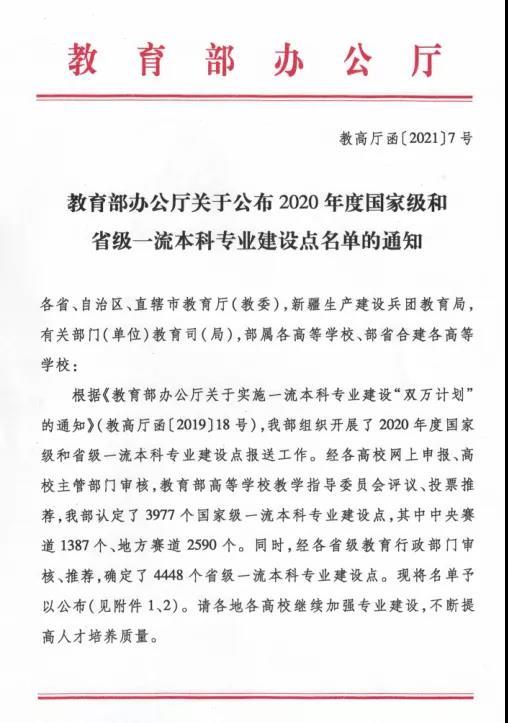 吉动喜报:我校新增国家级、省级一流本科专业建设点 发布者:教务部 发布时间:2021年02月28日 09:29:00 近日,教育部办公厅下发了《关于公布2020年度国家级和省级一流本科专业建设点名单的通知》(教高厅函[2021]7号),公布了2020年一流本科专业“双万计划”建设点名单。我校数字媒体艺术专业获批国家级一流本科专业建设点,环境设计专业获批省级一流本科专业建设点。 此次2个专业入围一流专业建设点项目,既是我校在十四五开局之年紧跟高等教育新形势,深入贯彻落实党的教育方针和“立德树人”根本任务,取得的一项重大建设成就;也是坚持学研产一体化办学模式,实施精准人才培养战略改革,建设特色高水平应用型现代产业大学取得的标志性成果之一。 近年来,学校抢抓机遇,不断创新,围绕产业群组建专业集群,全面深化学研产一体化人才培养模式,为我国文化产业发展培养了一批批高素质应用型人才。截止目前,我校共有2个国家级一流本科专业建设点,6个省级一流本科专业建设点,占现有招生专业总数的20%。今后,学校将继续贯彻落实全国教育大会和新时代全国高等学校本科教育工作会议精神,以国家级和省级一流本科专业建设为引领,完善十四五专业建设规划和动态调整机制,加快专业建设步伐,强化专业的示范辐射作用,提升专业建设整体水平和人才培养质量,进一步推动学校快速发展、健康发展、特色发展和内涵发展。 国家一流本科专业建设“双万计划”截止目前已开展2年,共认定8031个国家级一流本科专业建设点,其中中央赛道3078个、地方赛道4953个。同时,经各省级教育行政部门审核、推荐,确定了10658个省级一流本科专业建设点。
