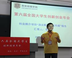 2013年11月16日—17日,第六届全国大学生创新创业年会在中南大学举行,我院2012年国家级创业实践项目《浩言配音文化传媒》从全国同类项目中脱颖而出,入选本届年会30个创业推介项目之一,也是吉林省高校唯一一项入选项目。我院教务处王春利处长、项目指导教师李佳和项目组骨干成员李达代表吉林省高校参加本届年会。李达同学向全国大学生创新创业工作专家组做了项目推介汇报,王春利处长代表学院在工作经验交流会上作了交流汇报。
